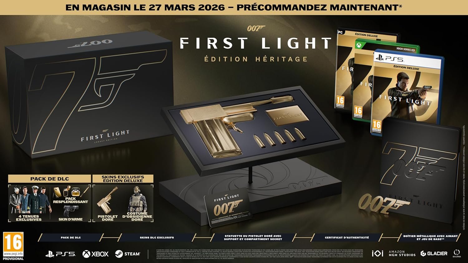 Rewrite Pre-order 007 First Light Legacy Edition today and receive the following content: • Base Game • Deluxe Edition Contents • Golden Gun Statuette • Certificate of Authenticity • Metal Case With Magnet (Steelbook) • Golden Gun weapon skin • Golden Obsidian Costume Follow a smart, and sometimes reckless young James Bond during his training in the new program 00, and discover the untold and revisited story of the origins of the most famous secret agent. Following an act of bravery, James Bond, a young Navy member, is enlisted in the Double 0 program. But when a mission to neutralize a seditious spy ends in tragedy, he must join forces with his mentor Greenway to unveil a conspiracy threatening the very heart of power. BECOME 007 Discover an untold story of the origins of James Bond, and follow the tumultuous journey of this hot head, who has become MI6’s best agent. Embark on exotic missions, pilot iconic vehicles and immerse yourself in a movie-worthy adventure in pursuit of a seditious agent always one step ahead. SPY IS YOU Opt for discretion or fight. Bare-handed combat or guns, gadgets or infiltration, bluff under the nose of the enemy, the choice is yours. WELCOME TO MI6 Test your spy skills and replay your favorite missions with additional modifiers for even more fun!