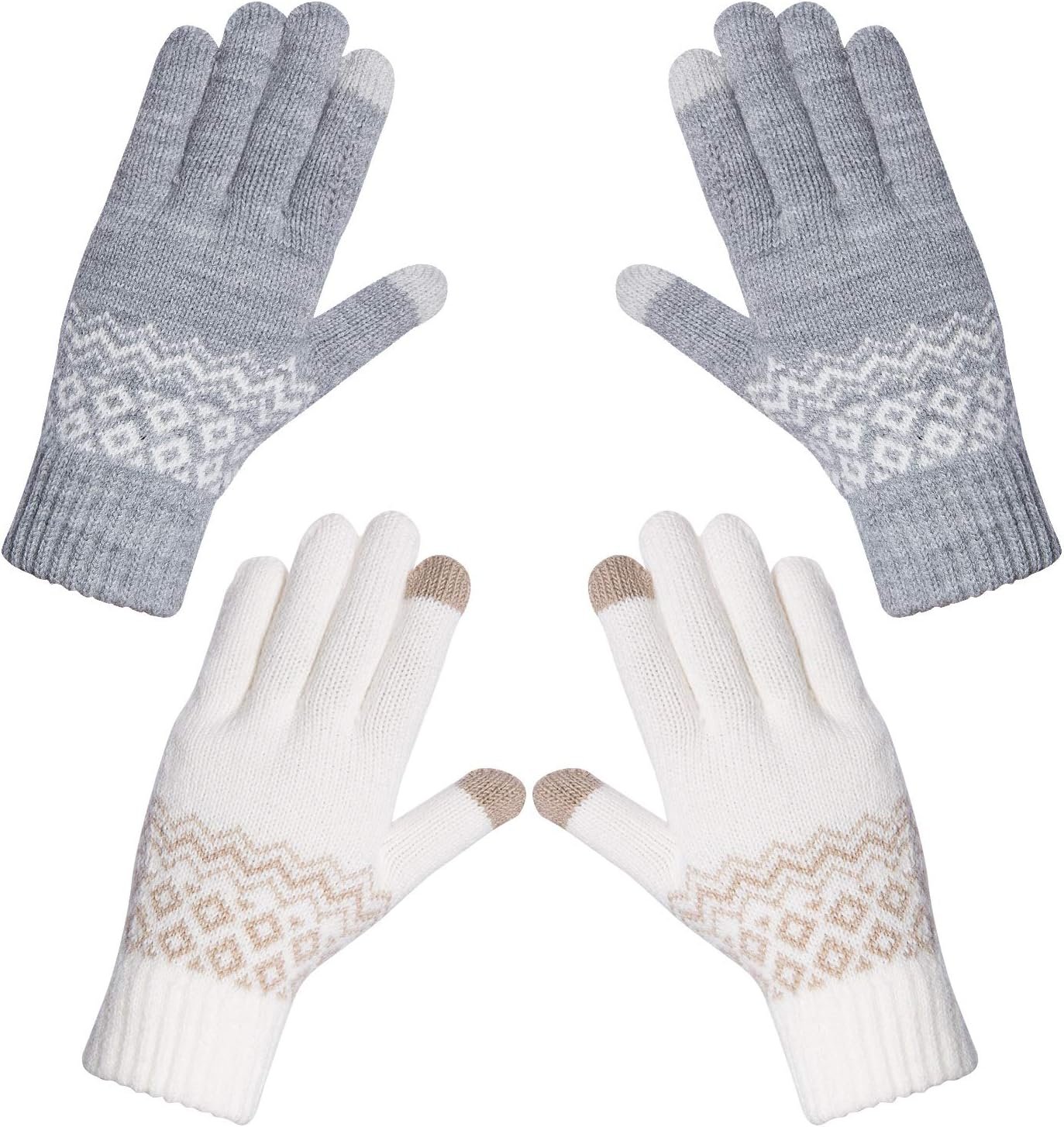 2 Pairs Women’s Winter Warm Touch Screen Gloves Knitted Soft Cute Elaphurus Pattern – White/Grey – One Size