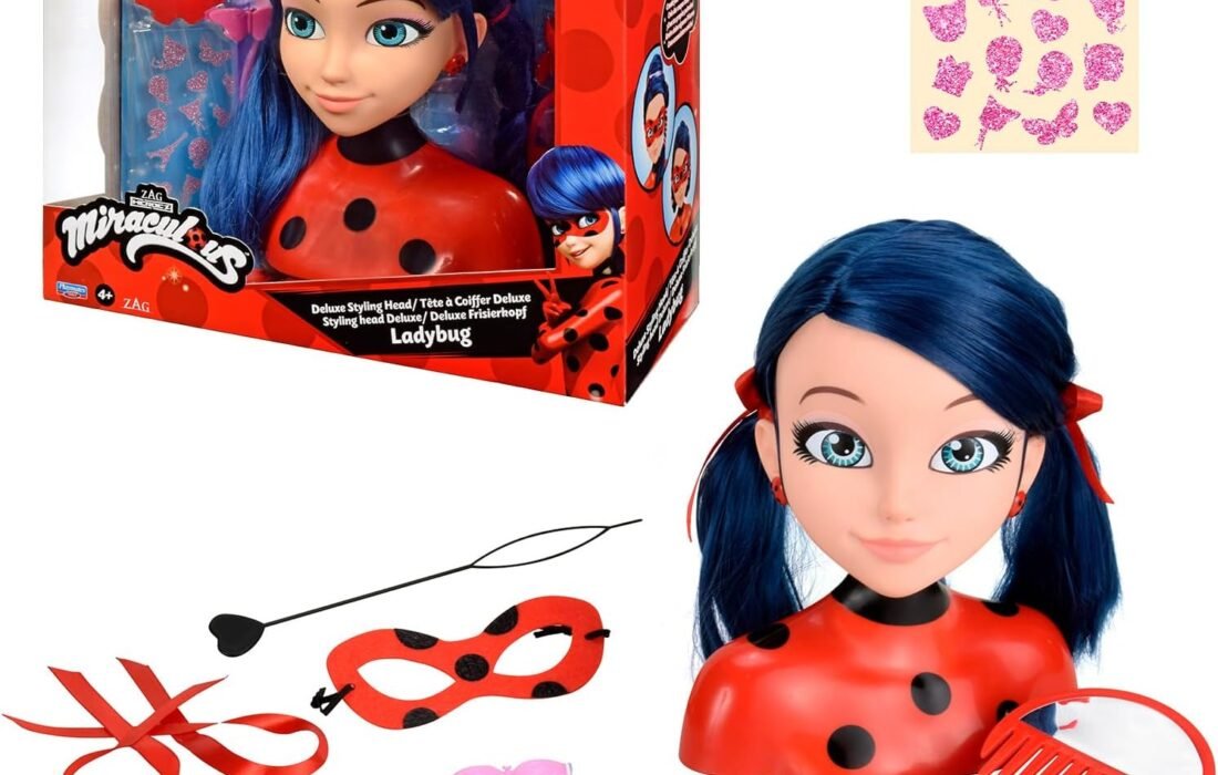 30 accessories included – Contents of the Miraculous styling head pack: 1 Ladybug styling head + 30 accessories, including 1 mirror comb, 2 coloured hair extensions, 2 hair bands, 2 hair clips, 2 ribbons, 2 hair spirals, 1 pair of red earrings + 1 pair of pink earrings, 12 balls + 1 applicator, 1 mask Ladybug and 1 sheet of shiny stickers to stick on Marinette’s face.