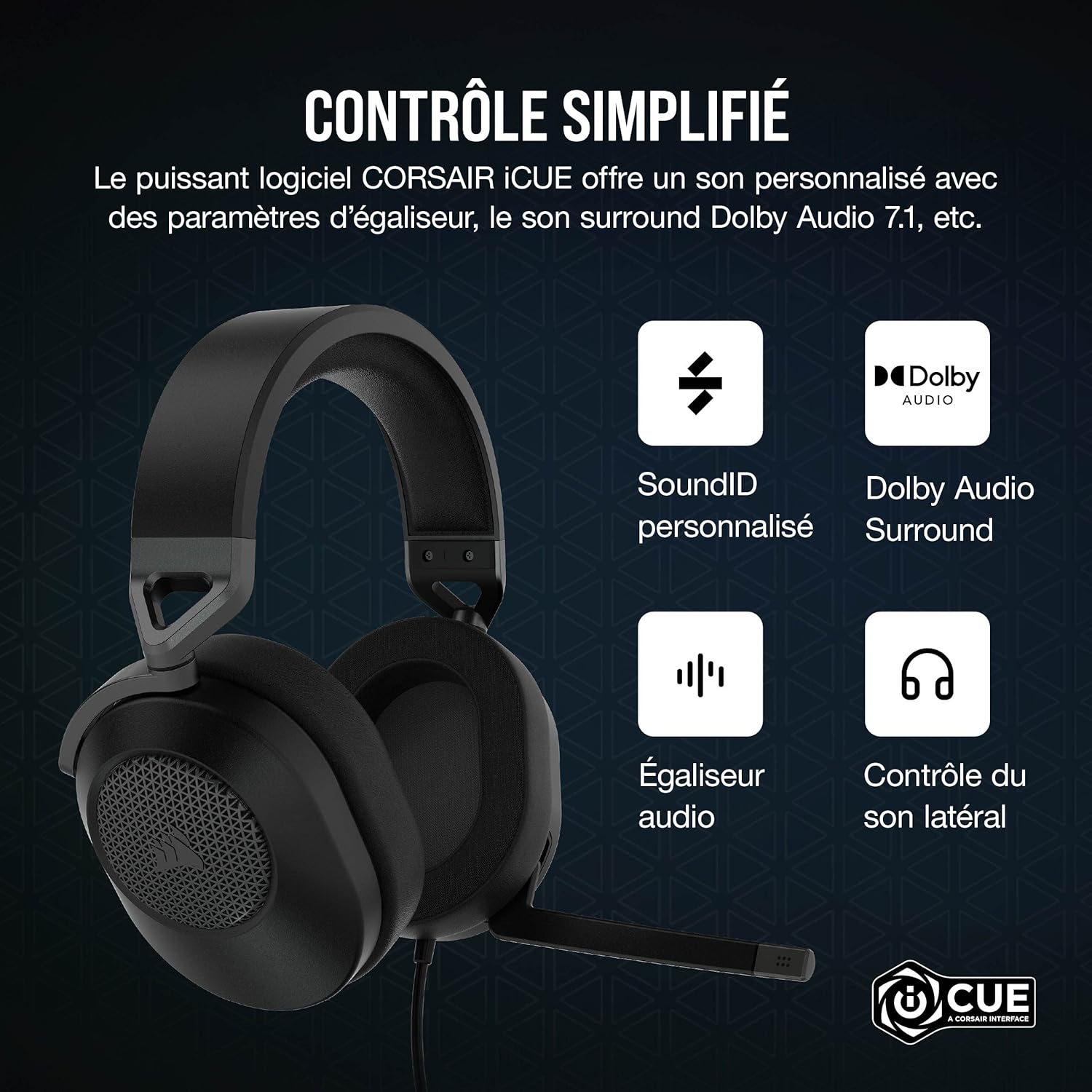 Rewrite With its synthetic leather memory foam ear pads, Dolby Audio 7.1 surround sound on PC and Mac, and a lightweight aluminum-reinforced design, the Corsair HS65 SURROUND gaming headset ensures long-lasting comfort and sound quality. Sonarworks’ SoundID technology allows you to customize your headphone settings to match your audio preferences. The omnidirectional microphone picks up your voice with clarity and precision, and custom 50mm neodymium audio drivers deliver exceptional sound quality and range. The 3.5mm audio connector ensures extensive compatibility with most devices, including PC, Mac, Xbox Series X | S, PS5 with Tempest 3D AudioTech support, PS4, Nintendo Switch and mobile devices. Corsair iCUE software allows you to adjust audio equalizer settings, 7.1 multi-channel surround sound and much more. With its convenient on-ear volume control, the HS65 SURROUND emits high-quality sound as soon as you start playing.