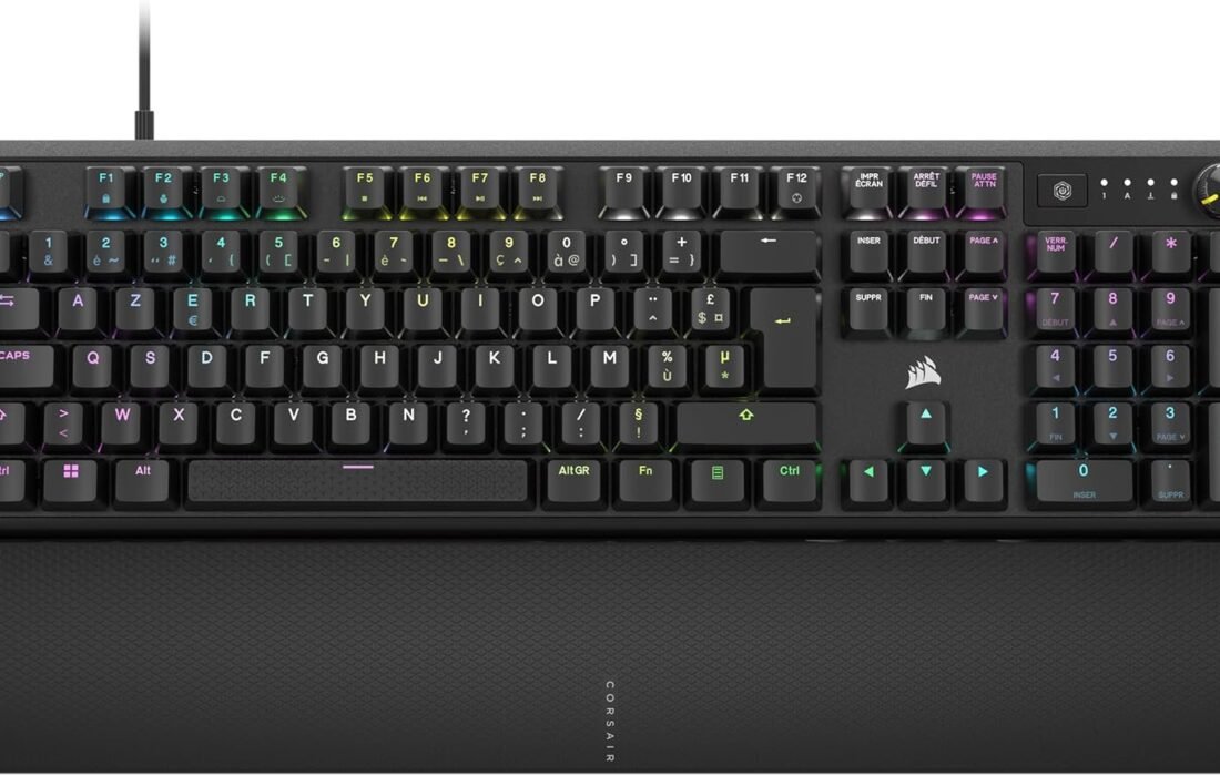 Personnalisez votre clavier avec iCUE : Prenez le contrôle avec CORSAIR iCUE et accédez à la personnalisation de l’éclairage RGB, le remappage de touches et la programmation de boutons multimédia. in French, in 200 words or less.