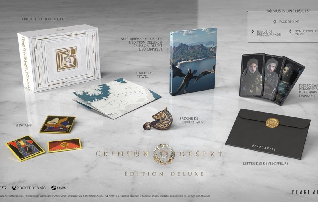 L’Édition Deluxe inclut le jeu complet Crimson Desert, le Pack Deluxe avec armures et équipements exclusifs pour Kliff et son cheval, ainsi que des bonus physiques tels qu’un SteelBook, une lettre des développeurs, une broche, une photocard, trois patchs et une carte de Pywel.