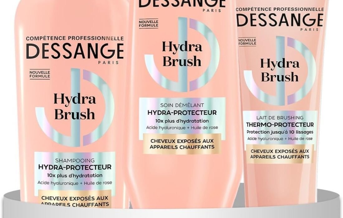 La routine Hydra Brush Dessange (shampoing, après-shampoing, lait thermo-protecteur) hydrate et protège intensément. Enrichie en acide hyaluronique et huile de rose, elle nourrit, renforce et préserve la souplesse.