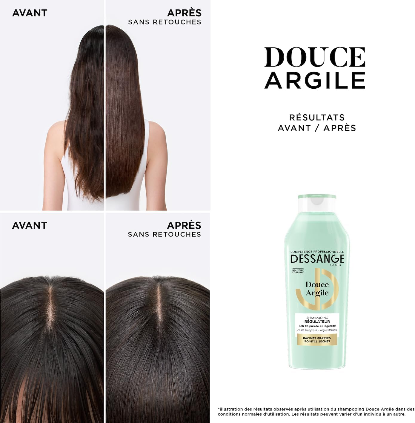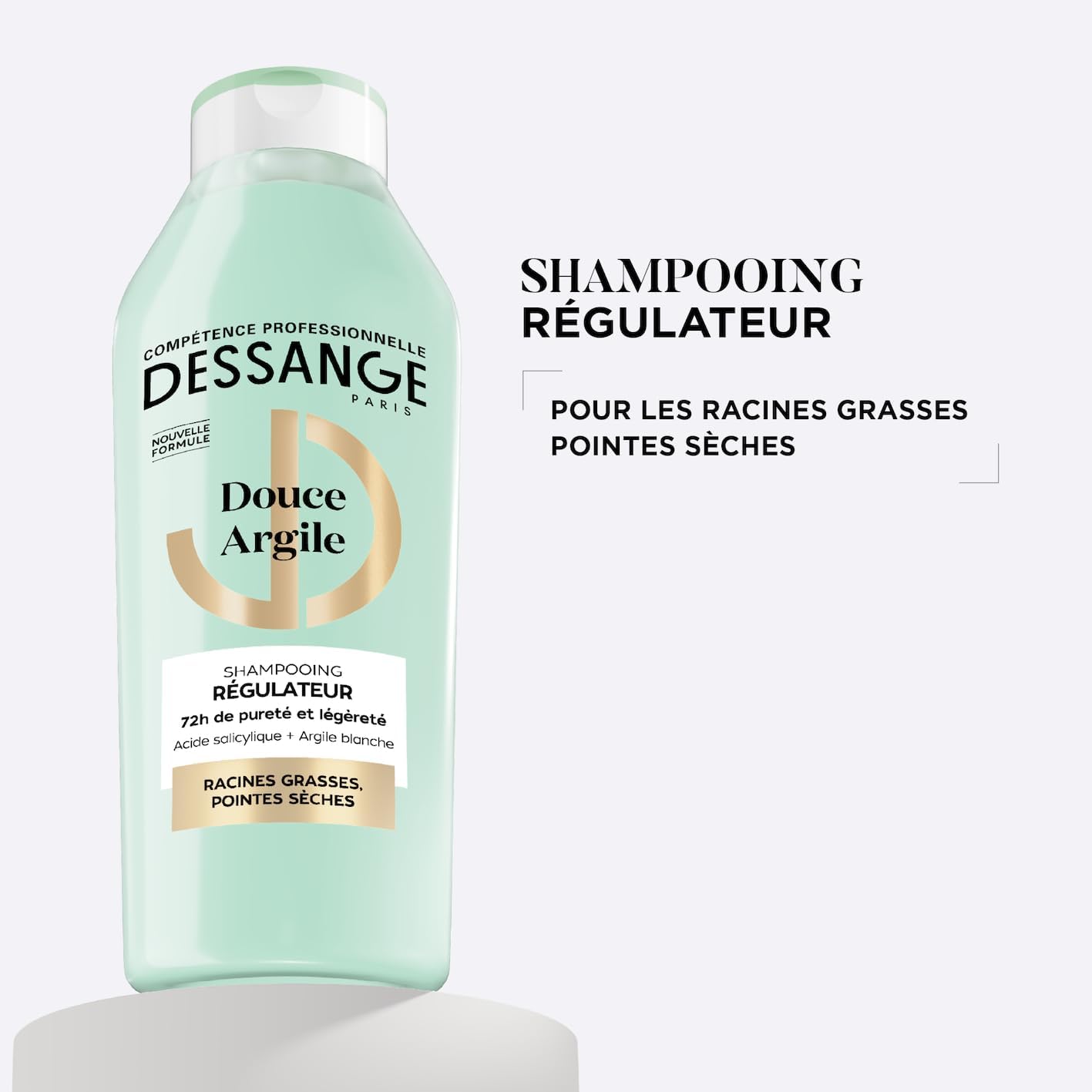 Rewrite Depuis 1992, Dessange Compétence Professionnelle, marque française iconique, met l’expertise des salons à la portée de toutes les femmes en proposant des soins capillaires professionnels qui subliment les cheveux, sans passer par le salon de coiffure. Grâce à des formules sensorielles, innovantes et adaptées à chaque type de cheveu, Dessange révèle la beauté de votre chevelure jour après jour. Le déséquilibre du cuir chevelu peut rendre vos racines grasses tandis que vos pointes restent sèches et fragiles. Le shampoing régulateur Douce Argile a été spécialement conçu pour purifier les racines tout en nourrissant les longueurs. Enrichi en acide salicylique et argile blanche, il élimine l’excès de sébum, rééquilibre le cuir chevelu et apporte douceur et légèreté aux pointes. Dès la première utilisation, vos cheveux sont frais, aérés et visiblement plus sains. Pour des résultats optimaux, complétez le protocole avec les produits capillaires Dessange. *Selon un test réalisé sur 60 consommateurs après 72 heures.