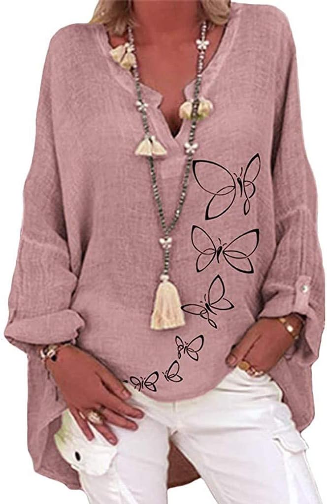 Elegant Women’s Long Sleeve Linen Cotton Shirt V Neck Casual Tops Loose Fit Summer Top Solid Color Tee Shirt Loose Breathable Clothes Cheap