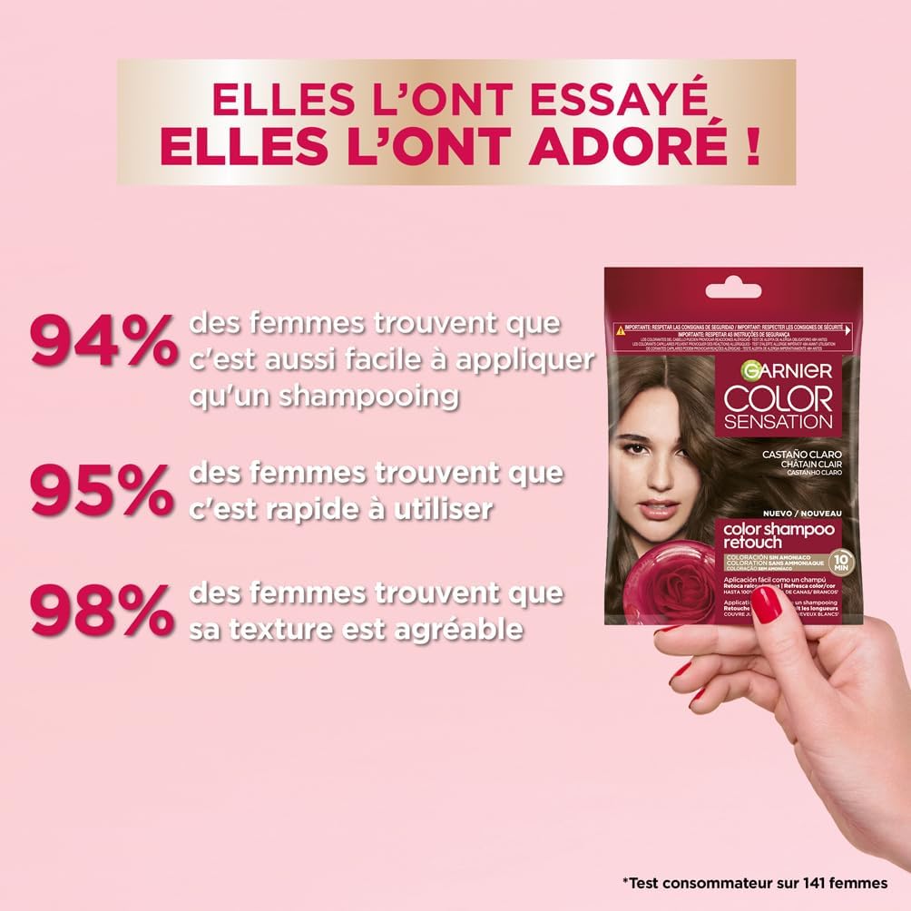 Rewrite Découvrez Color Shampoo Retouch, la nouvelle coloration permanente sans ammoniaque pour retoucher ses racines en seulement 10 minutes. Color Shampoo retouch s’applique aussi facilement qu’un shampooing, avec les mains. Ce nouveau geste de retouche couvre 100% des cheveux blancs* pour une tenue jusqu’à 4 semaines*. Retrouvez les 5 nuances fondamentales Color Shampoo Retouch compatibles avec votre couleur**. * Tests instrumentaux ** Voir tableau de correspondance sur le site garnier.fr