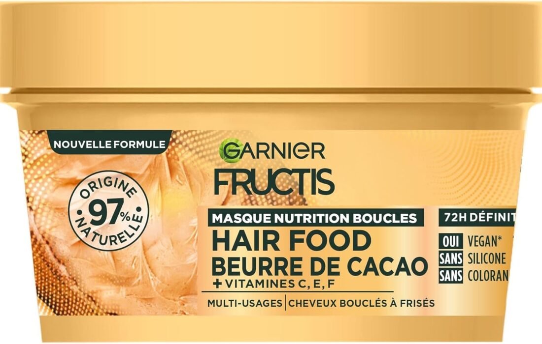 Rewrite Discover our ultra-nourishing Hair Food mask with cocoa! Its generous texture & its new formula enriched with vitamins C, E & F* nourish the hair deeply for 72 hours of definition**. * vitamin C and F derivatives ** Instrumental test