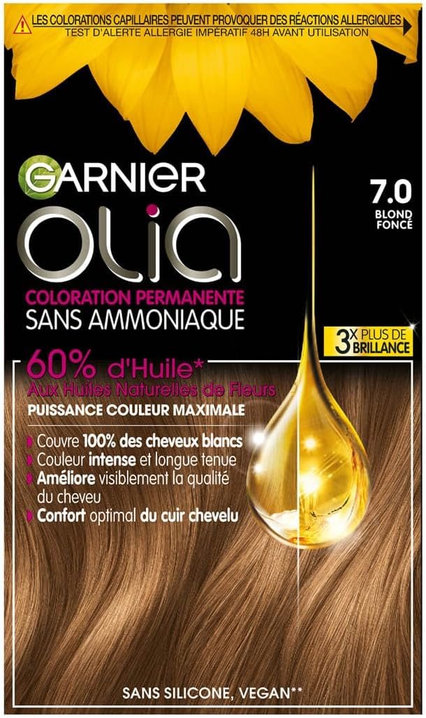 Contents: 1 x Garnier Olia permanent hair dye, dark blonde (7.0). Includes: gloves, bottle bottle, developer cream, colour cream, care and instructions for use in French, in 200 words or less.