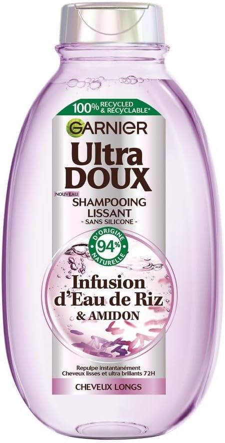 Contenu : 1x Garnier Ultra Doux, Shampooing lissant douceur & brillance à l’infusion d’eau de riz, Contenance : 250 ml in French, in 200 words or less.
