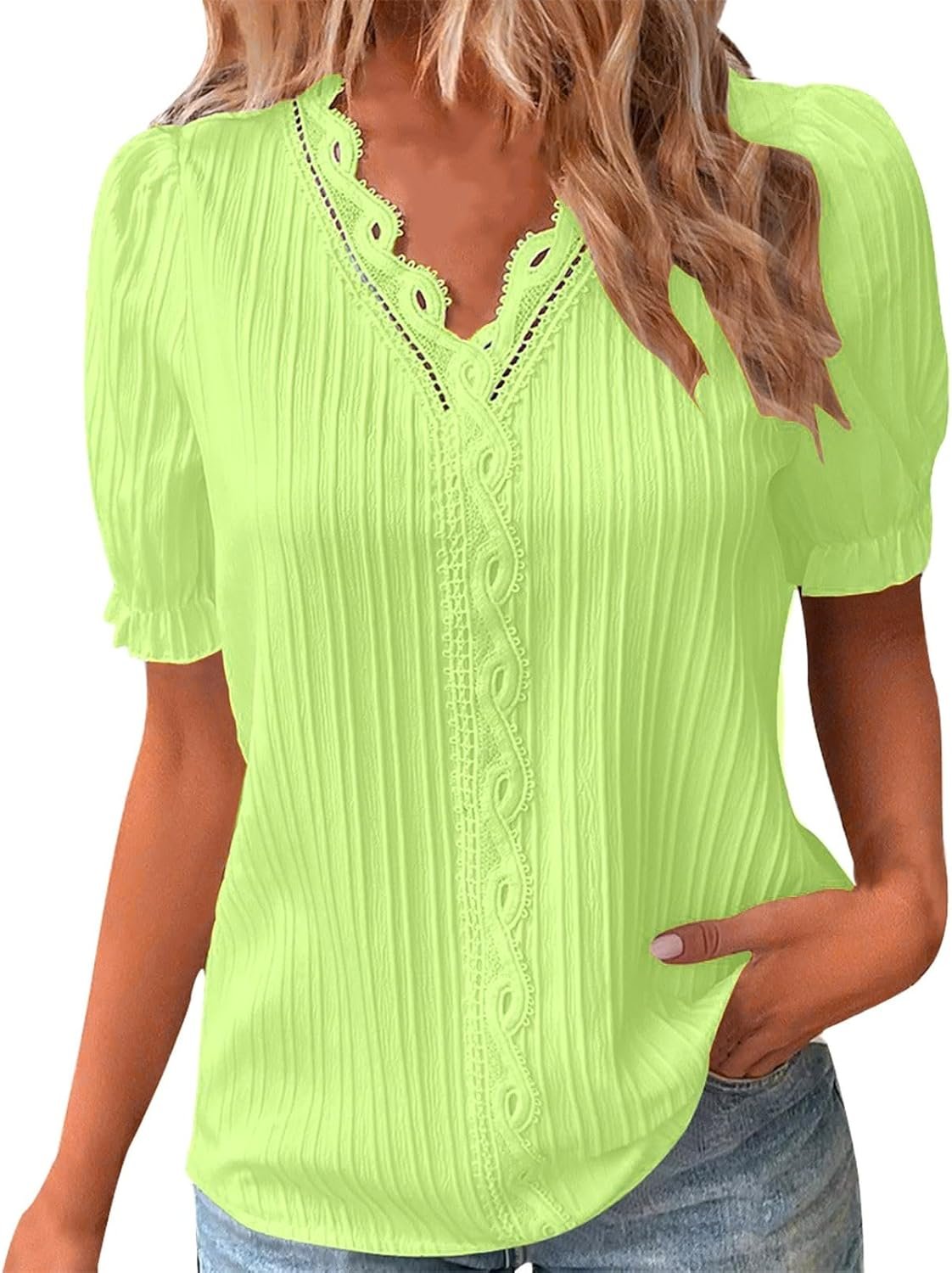 Women’s Summer Shirt Lace V Neck Solid Color Lace Shirt Elegant Fashion Solid Color Elegant Blouse Short Sleeve Comfortable Soft T-Shirt: Wavy Colour: as shown in the picture. Due to the difference between different monitors, the picture may have a little color difference. Please make sure you do not mind this before ordering. Thank you very much). Package Weight: 165g