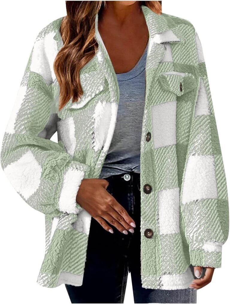 Generisch Women Fleece Jacket Casual Plaid Plush Button Down Jacket Warm Winter Jacket with Pockets Loose Fashion Fleece Coat