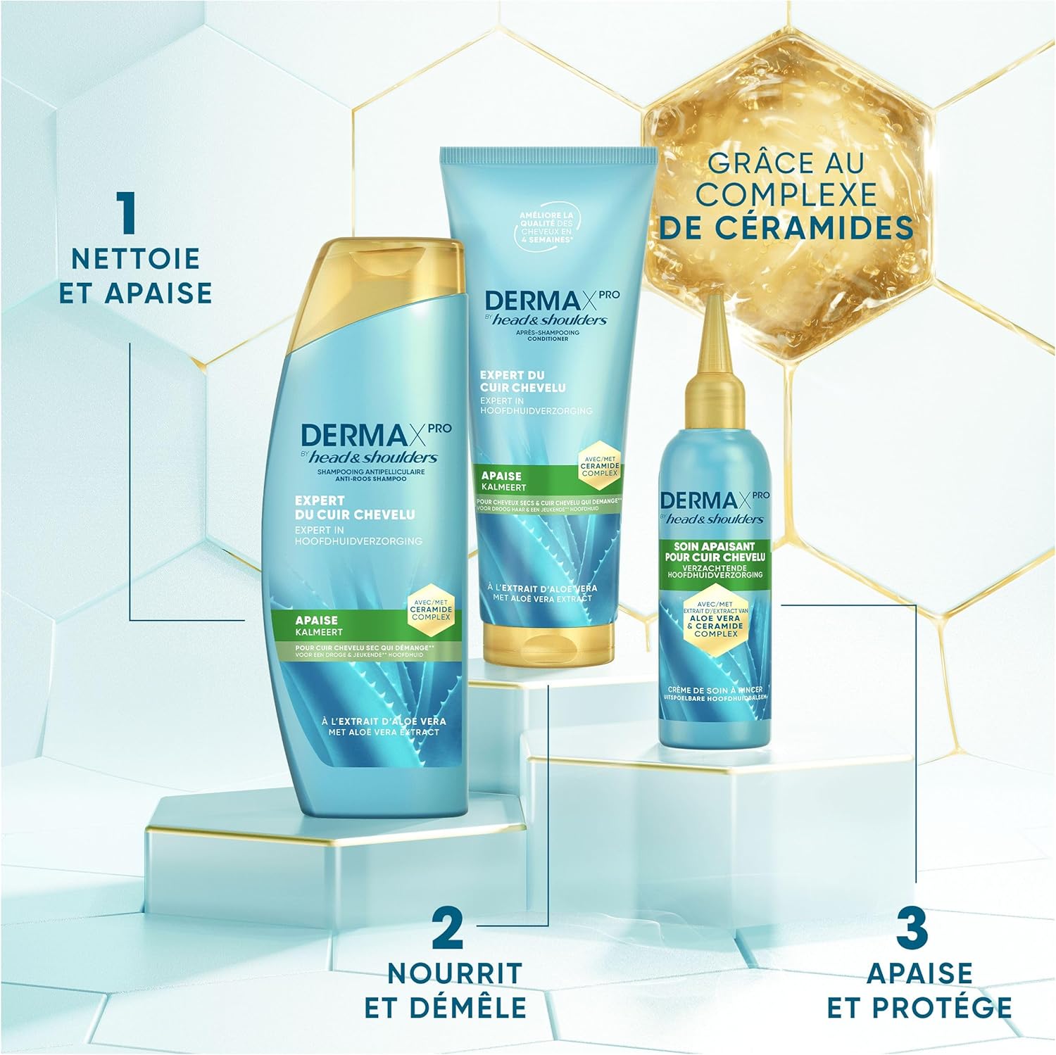 Rewrite Did you know that a dry scalp with dandruff needs not only moisturizing? When the scalp is dry, the level of ceramides is lower. Ceramides are lipids naturally present in the skin that help hold cells together and prevent dehydration. DermaXPro by Head & Shoulders Soothe Anti-Dandruff Shampoo, infused with aloe vera extract and a ceramide complex (piroctone olamine + ceramide), is used on the scalp surface to help restore ceramide levels and repair dry skin areas. This product is intended especially for itchy scalps* and are unbalanced. In addition, it has been clinically proven to restore ceramides in the skin and reduce itching* of the scalp. The result? Your scalp is hydrated, soothed and dandruff free**, allowing you to reveal the full potential of your hair. (*itching related to dandruff. **Visible film from the first use)