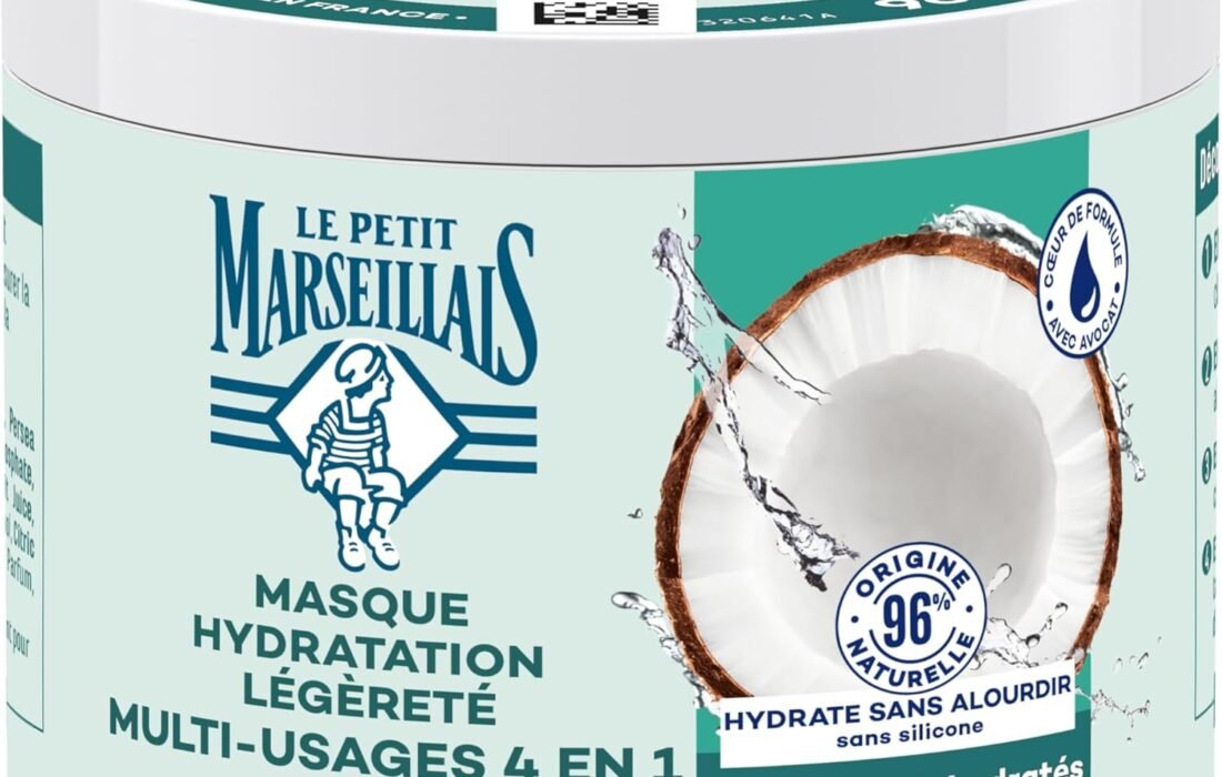 Rewrite Le Petit Marseillais 4-in-1 Lightweight Hydration Mask Organic Coconut Water Offer your dehydrated hair complete care with the Le Petit Marseillais 4-in-1 Lightweight Hydration Mask. Made in France, this multi-purpose mask, formulated with Avocado Oil, moisturizes without weighing down and leaves your hair light, soft and perfectly nourished. A 4 in 1 care to meet all your needs: 1. IN MASK: To hydrate lightly, apply to wet hair for 3 minutes, then rinse. 2. AFTER SHAMPOO: To detangle while moisturizing without weighing down, apply to wet hair 1 minute, then rinse. 3. RINSING FREE: To moisturize your ends, apply to wet, wet or dry hair. 4. IN NIGHT MASK: For an extra dose of hydration, apply a small amount of dry to the lengths before sleeping and rinse off when you wake up. A natural and respectful formula: – 96% ingredients of natural origin: Carefully selected active ingredients for effective and sensory care. – Silicone-free: For a natural feel and an incomparable lightness. – Dermatologically tested. The benefits of the product at a glance: – Multi-use: mask, conditioner, leave-in care, night mask. – Moisturizes without weighing down. – Gentle formula: Organic coconut water and formula heart with avocado. – Made in France, respecting hair and the environment. – Large 370ml size for extended use. Pamper your dehydrated hair with this versatile mask that combines hydration and lightness every day.