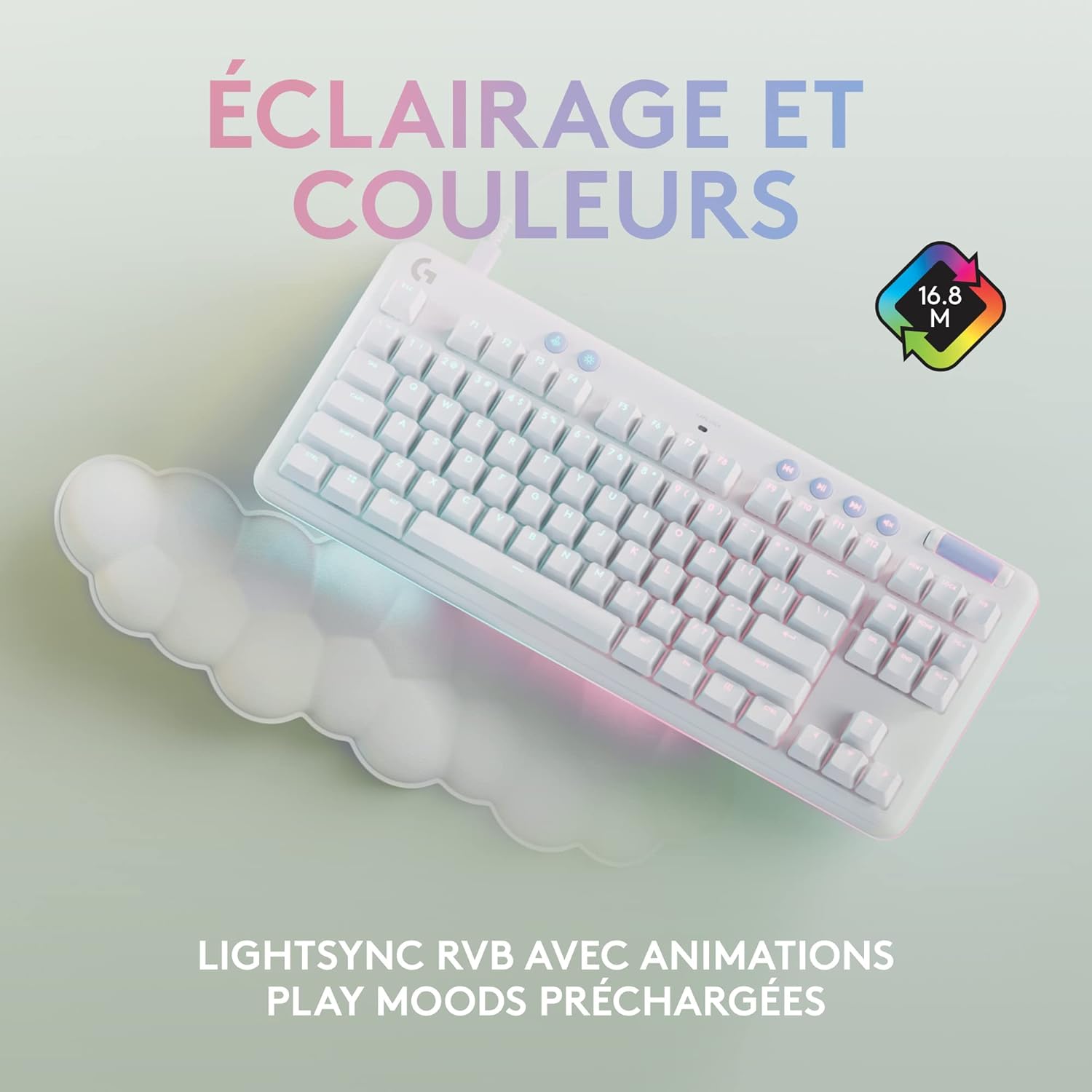 Bel éclairage : sur les touches et le contour, éclairage RVB Logitech LIGHTSYNC avec Play Mood préchargées, de la collection Aurora ; personnalisez l’éclairage du clavier gamer RVB sur le G HU