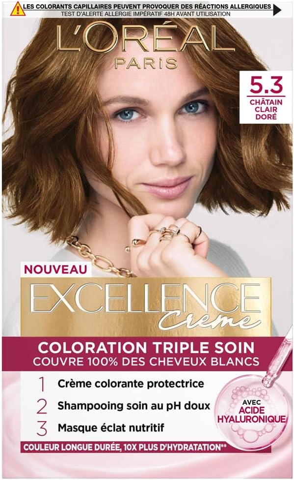Contenu : 1x L’Oréal Paris Creme Excellence coloration longue durée, contenu : 1x crème colorante, 1x révélateur de couleur, 1x shampooing, 1x conditionneur, 1 paire de gants jetables in French, in 200 words or less.