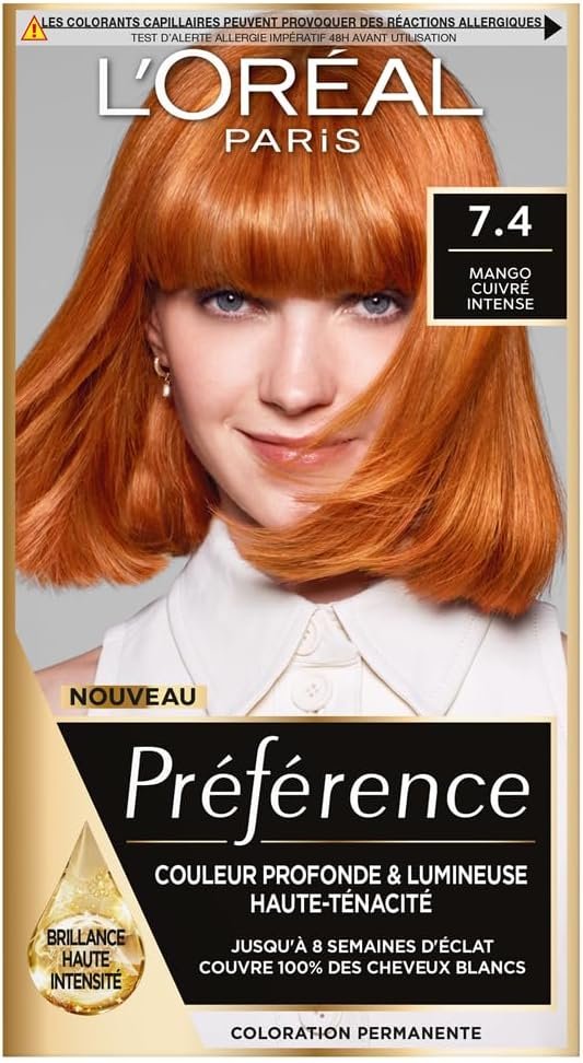 Contents: 1 x L’Oréal Paris Preference, Dublin Mango (7.4), Includes: 1 bottle of colour gel (60 ml), 1 applicator bottle with developer (90 ml), 1 tube of radiance protector (53 ml), 1 gloss oil, 1 instruction manual and 1 pair of gloves in French, in 200 words or less.