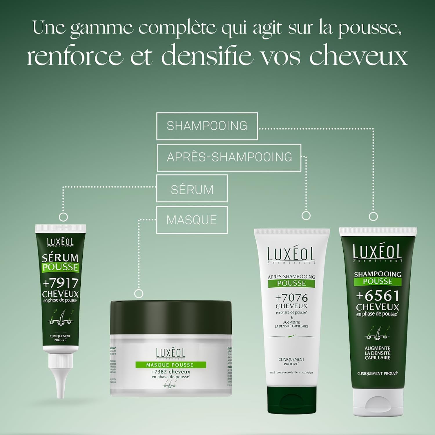 Directions for use: Apply 3 times a week to wet hair. Massage, leave for 3 minutes and rinse. This shampoo cleanses without weighing down and moisturizes your hair. To complete your Pousse routine, use Luxéol Serum Pousse as a supplement.