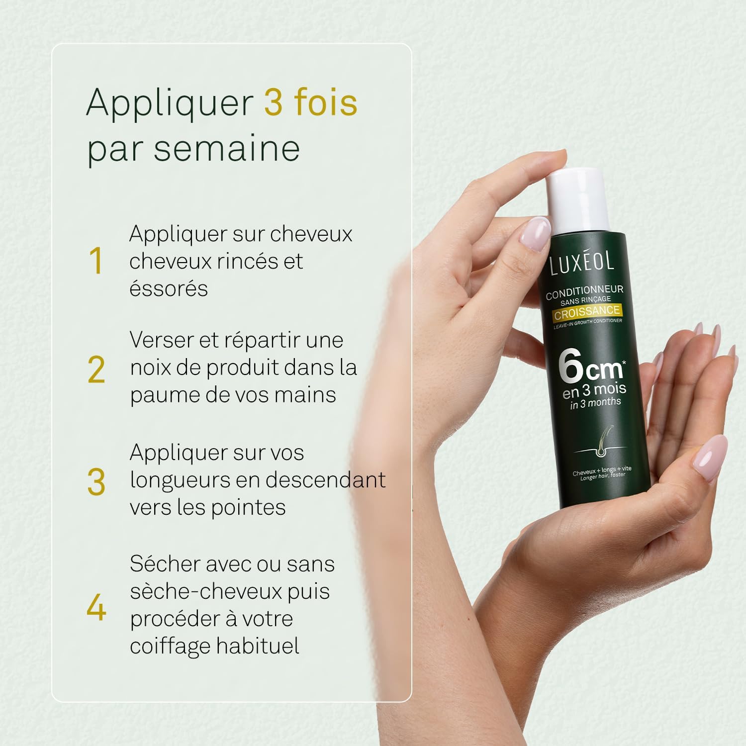 Directions for use: After Luxéol Growth Shampoo, apply the Luxéol Croissance Leave-In Conditioner, 3 times a week after the Growth Shampoo, to rinsed and towel-dried hair. Do not rinse. in French, in 200 words or less.
