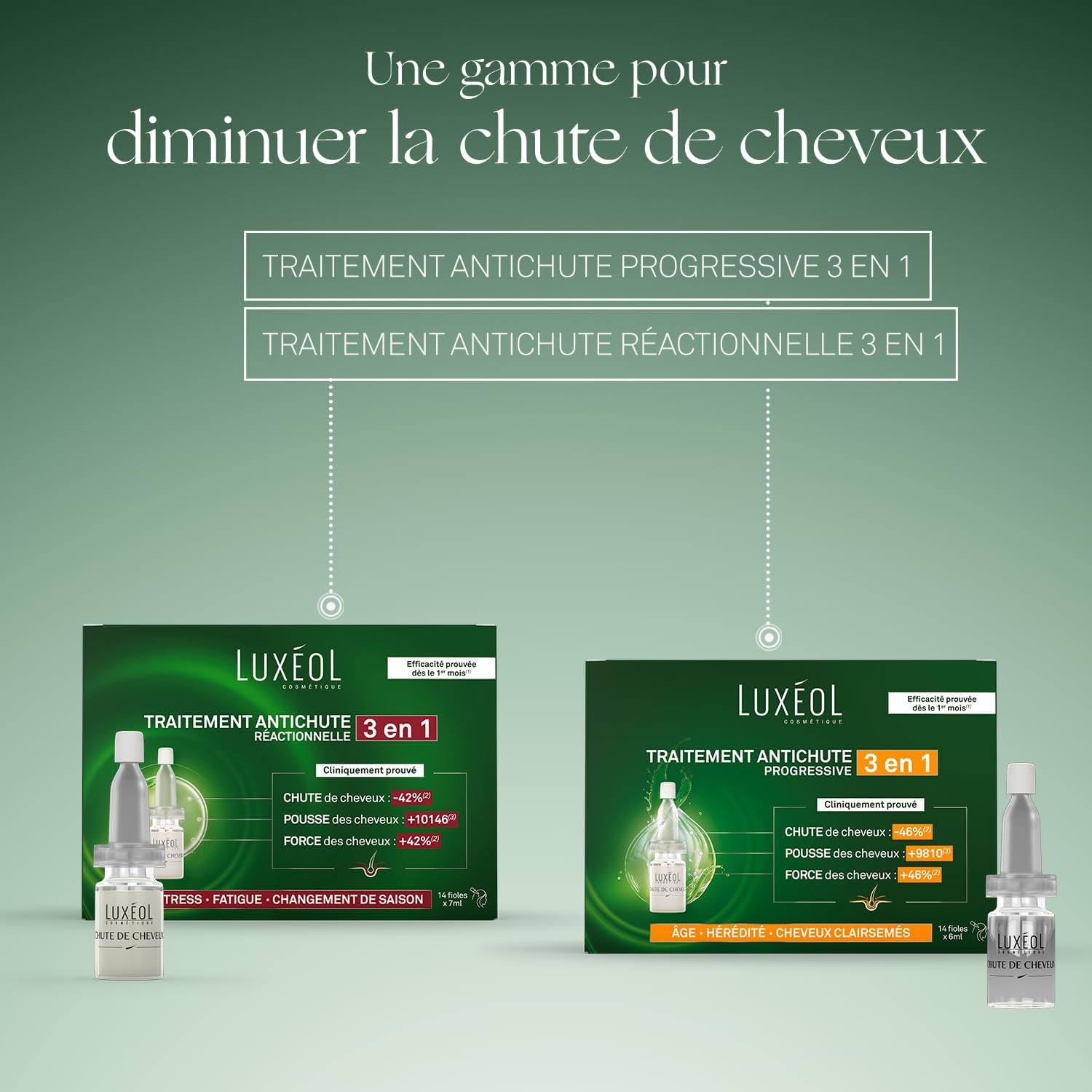 Rewrite Hair specialist, Luxéol offers a range of food and cosmetic supplements to help you find healthy hair***. The Luxéol brand, expert on its core business, is recognized for the reliability of its products and their conclusive results. Made from high quality ingredients in accordance with regulations, Luxéol hair products are meticulously researched, developed and manufactured to provide the best solutions to hair problems for women and men. Hair loss? Thinning hair? Hair mass that is getting depleted? Take back possession of a dense and vital hair with the Luxéol 3-in-1 Progressive Hair Loss Treatment! Results: This protocol has been the subject of two clinical studies, one in 27 men and the other in 28 women, with progressive hair loss. After 3 months of using 3 vials per week, the study on men demonstrated: (1) A decrease in the number of hair in the phase of falling (telogen phase) or an increase in the number of hair saved from the fall phase of 7318 hair. (2) An increase in the number of existing hairs in the growth phase (anagen phase) by +9810 hair. After 3 months of using 3 vials per week, the study on women demonstrated: A decrease in the number of hair in the phase of falling (telogen phase) i.e. an increase in the number of hair saved from the phase of hair loss of 5660 hairs as well as an increase in the number of existing hairs in the growth phase (anagen phase) of +8112 hair. (3)Increased strength and reduction of hair loss, overall average after 3 months of use of 3 vials per week % satisfaction: Hair is more resistant: 92%** Hair is more hydrated: 88%** Hair regains vitality: 88%** Hair is stronger: 88%** Hair is shinier and softer to the touch: 92%** Hair is shinier and softer to the touch: 92%** Hair is stronger Hair is less brittle : 96%** Overall satisfaction: 100%** ** Use test on 27 men, % satisfaction, after 3 months of use of 3 vials per week. Capacity: 1 box of 14 vials of 5 ml. ***thanks to the zinc contained in Growth & Fortification (capsules), Grey & White Hair Pigmentation, Reactive Hair Loss (capsules), Hair Loss, Brewer’s Yeast, Zinc 15, Keratin Complex, Strength and Growth Gummies, Hair Growth Gummies, Gummies Hair Loss, which contributes to the maintenance of normal hair and thanks to vitamin B88. contained in Luxéol Biotin 1000 helps maintain normal hair.