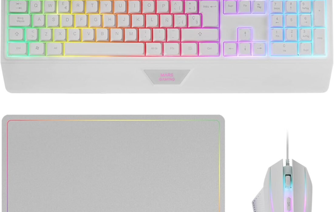 Mars Gaming MCP124WFR, 3-in-1 Gaming Combo, H-Mech LED RGB Ergonomic Keyboard, HUANO 3200DPI RGB Mouse, Nanotextile Mat 360 x 260 mm, Multiplatform Compatibility, French Layout, White