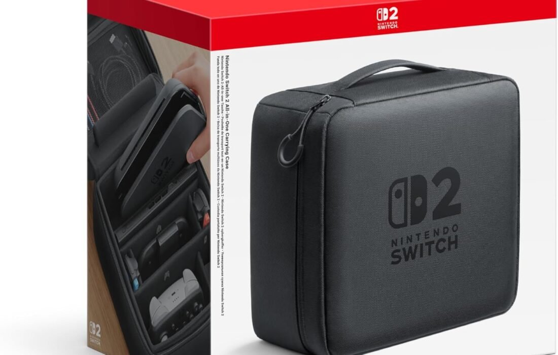 The pouch holds and carries all the equipment needed to use the console in TV mode, including a Nintendo Switch 2 console, a Nintendo Switch 2 dock, two Joy-Con 2 controllers, multiple cables, and up to six game cards. in French, in 200 words or less.