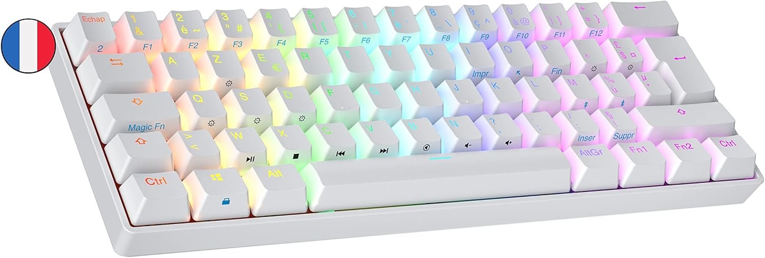 Ranked N60 Nova Mechanical Gaming Keyboard 60% | Hot Swap Gaming Keyboard | 62 Programmable Keys | RGB LED | Mac, Windows PC | French AZERTY (White, Gateron Pro Yellow)