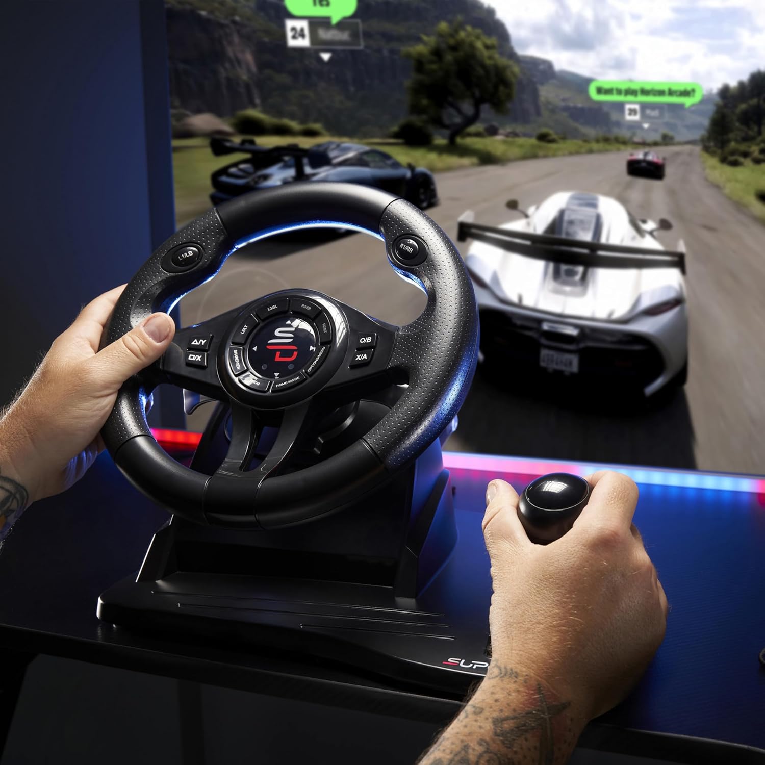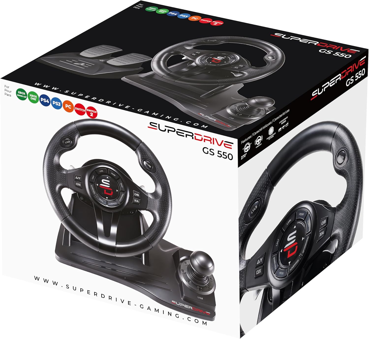 Rewrite Steering wheel compatible Xbox Series X/S, PS4, Xbox One and PC. Double vibration motor. Gear lever +/-. Crankset with acceleration and brake pedals and non-slip pads for optimal stability. Gear shift paddles +/-. Fully replaces the controller: navigation through the menus via the D-pad and buttons on the steering wheel. 270° rotation angle. Sensitivity adjustment (3 levels of sensitivity). Attaches to a desk with suction cups. Reprogrammable buttons to suit all types of games. Plugs directly into the controller. 100% compatible with all racing games on PS4, Xbox and PC (Gran Turismo 7, Forza Motor Sport 7, Forza Horizon 5, Project Cars 2, F1 2020, Need for Speed, Dirt, WRC, Grid, V Rally 4, Gear Club 2…and even GTA V etc). Not compatible with PS5.
