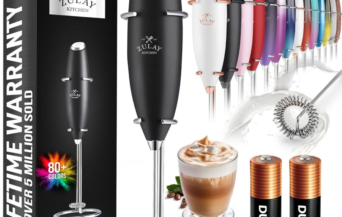 Zulay Kitchen Electric Milk Frother – Milk Frother with Stainless Steel Stand – Mini Coffee Frother for Lattes – With Stand – Black